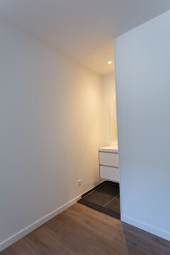 Tevens zijn de woon -en slaapkamer afgewerkt met pvc vloer en vloerverwarming.